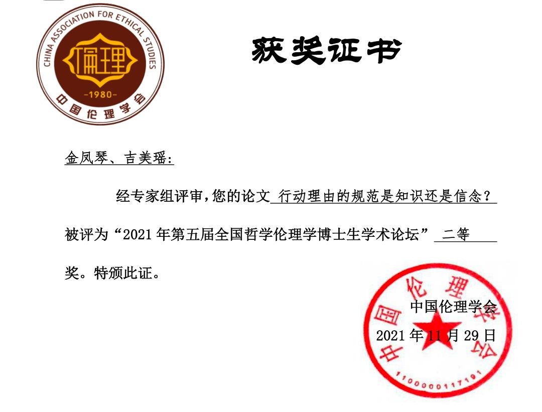 20211127-28日,我系研究生积极参与了“2021年第五届全国哲学伦理学博士生学术论坛”并获奖。在100多篇论文中,我系共有三篇论文获奖。金凤琴、吉美瑶的论文《行动理由的规范是知识还是信念?》获二等奖,徐子涵的论文《改进的证据主义——基于普遍意义的辩护》和林玉玲的论文《论认知不正义的不可克服性》获三等奖。